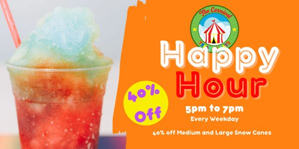 We're happy to introduce our new happy hour! During the happy hour time, we will be offering 40% off medium and large snow cones to help keep you cool as the weather heats up. Enjoy an array of flavors over a popular shaved ice dessert!